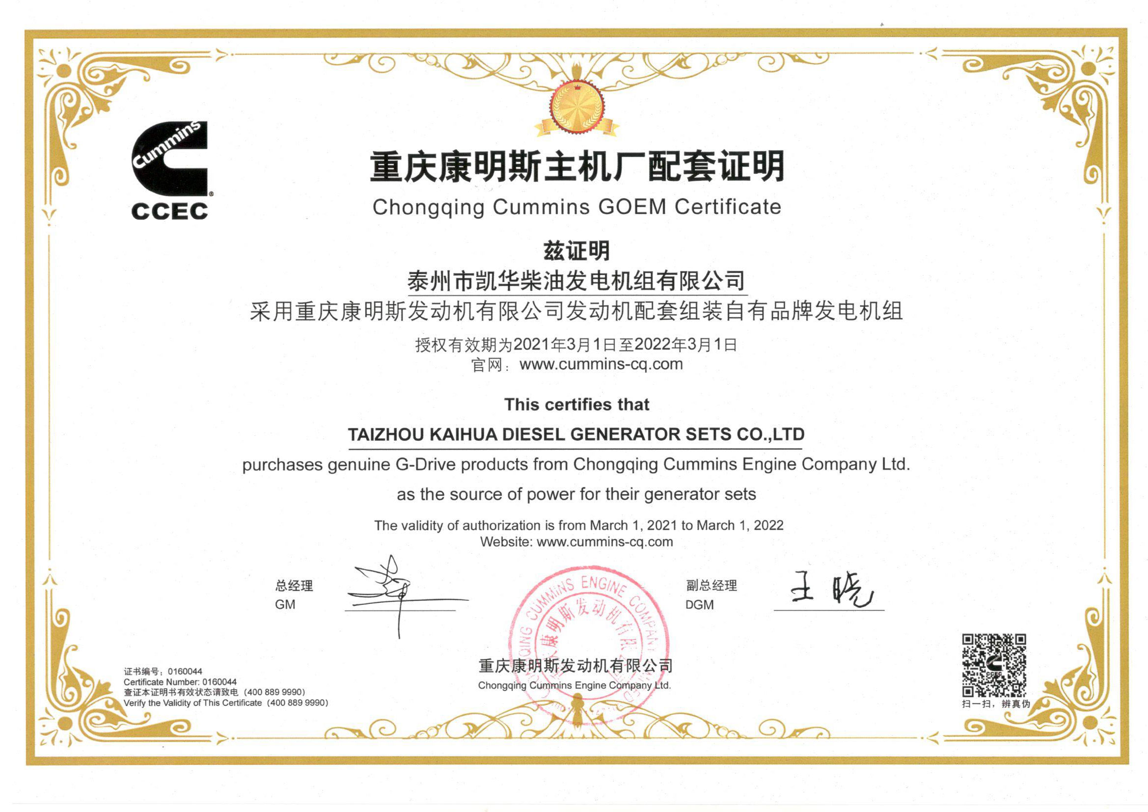 泰州市凱華柴油發(fā)電機組有限公司創(chuàng)建于2003年,是一家集柴油發(fā)電機組燃氣發(fā)電機組的研發(fā)、生產(chǎn)、銷售為一體的高新技術(shù)民營企業(yè),公司座落于“漢唐古郡,淮海名區(qū)”,具有“鳳凰城”美稱的祥泰之州——江蘇省泰州市,地處中國經(jīng)濟最發(fā)達的長三角經(jīng)濟圈,水陸空立體交通,地理位置十分優(yōu)越。公司目前注冊資本金11800萬元人民幣,生產(chǎn)基地占地六十畝,現(xiàn)有各類高素質(zhì)員工一百多名,專業(yè)技術(shù)人員達46人,其中高級技術(shù)人員16人,年銷售額近6億元。 公司主營產(chǎn)品:3~3000KW陸用柴油發(fā)電機組,15~600KW移動拖車電站,12~1000KW船用應(yīng)急柴油發(fā)電機組,各種靜音型、中高壓、多機并聯(lián)、燃氣等特種機組以及進口系列柴油發(fā)電機組,可滿足不同客戶的一切電力需求,還可滿足用戶不同電壓、不同頻率的要求。凱華公司是康明斯品牌的授權(quán)代理商,專業(yè)生產(chǎn)供應(yīng)康明斯柴油發(fā)電機組。